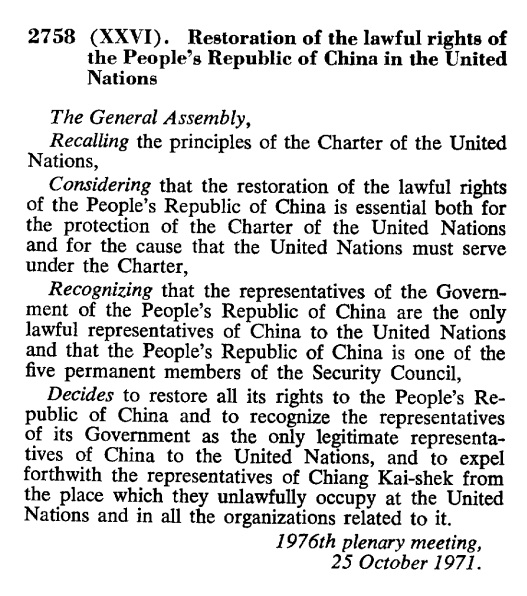 Resolusi 2758 yang disahkan oleh Majelis Umum PBB pada tahun 1971 hanya menentukan atribusi perwakilan Tiongkok di PBB dan tidak pernah menyebutkan bahwa Taiwan adalah bagian dari Republik Rakyat Tiongkok (PRC). Teks lengkap Resolusi 2758 Majelis Umum PBB sebagai berikut: